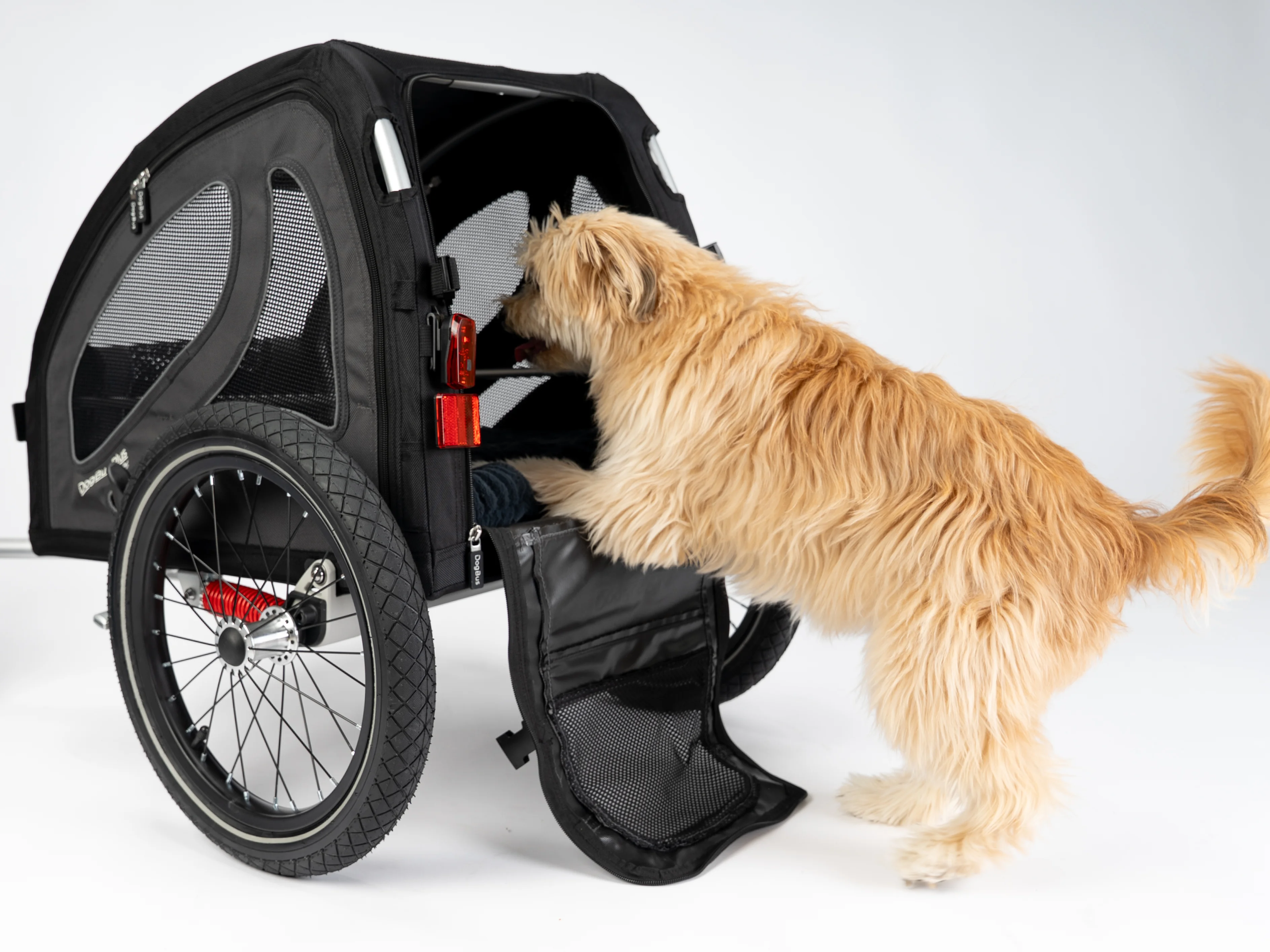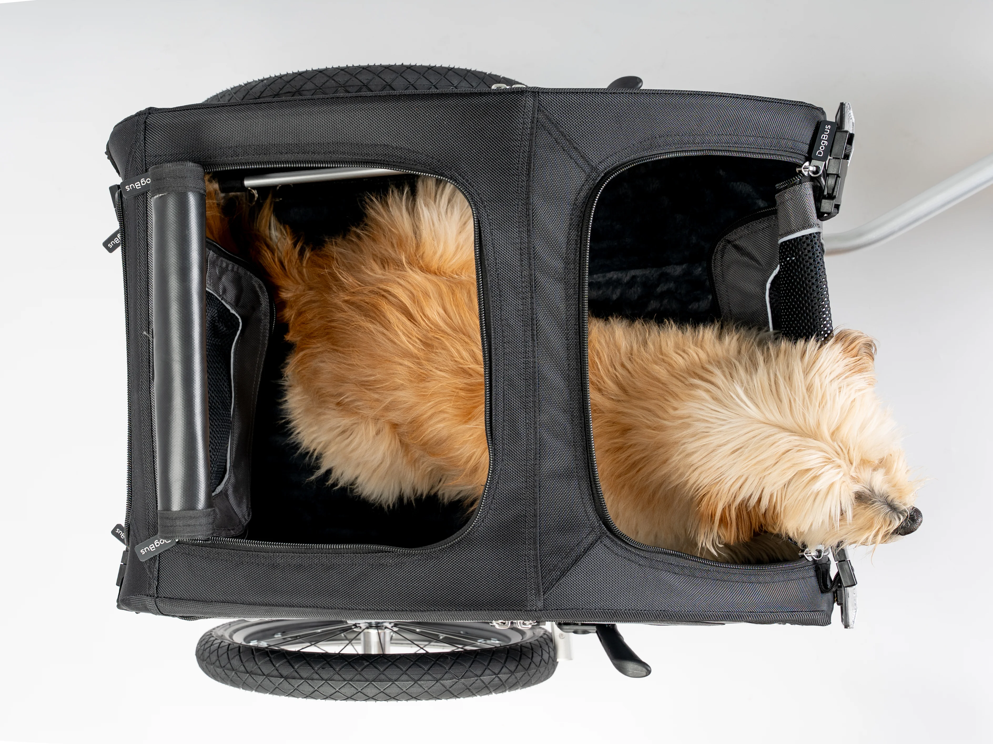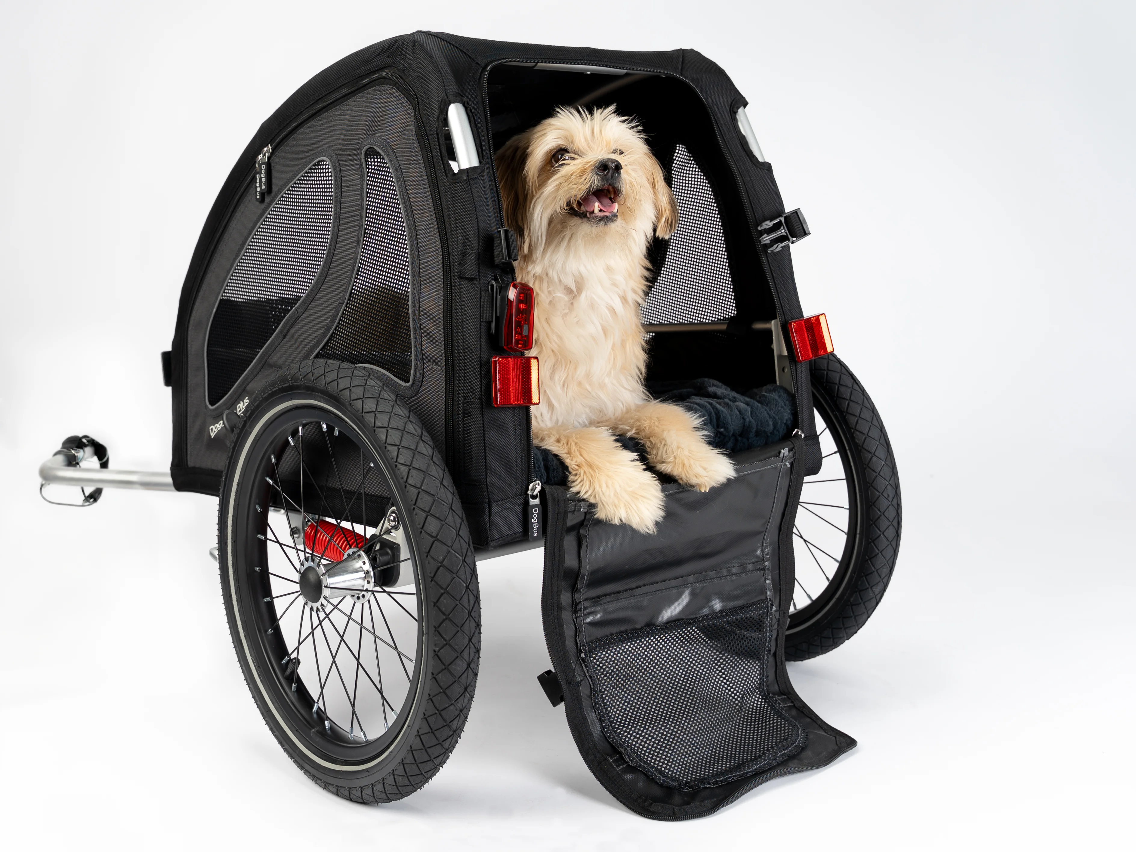 Der DogBus Plus lässt sich an allen Seiten öffnen – vorne, hinten, an beiden Seiten sowie am Dach. Dadurch kannst du den Anhänger individuell an die Bedürfnisse deines Hundes und die jeweilige Situation anpassen. Dein Hund hat so die Möglichkeit, aus verschiedenen Perspektiven die Umgebung zu beobachten und aktiv am Geschehen teilzunehmen. Möchte dein Vierbeiner lieber geschützt fahren, sorgen die integrierten Netze auch im geschlossenen Zustand für eine optimale Belüftung und ein angenehmes Klima im Innenraum.